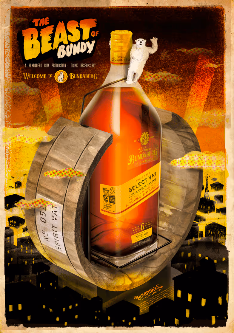 When it’s called ‘The Beast of Bundy’, you know it’s going to be big. Our job was to make it beautiful. A 4.5L bottle of Bundaberg Select Vat is hard to miss, and even harder to pour. To educate consumers about the extra craft that goes into making this premium rum — and the extra four years it spends in the vat — we created a physical representation of an actual Bundaberg Distilling Co. vat which cleverly functioned as a pouring cradle.